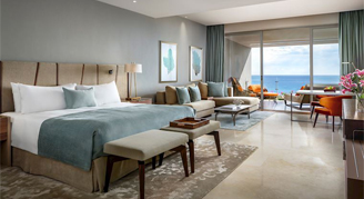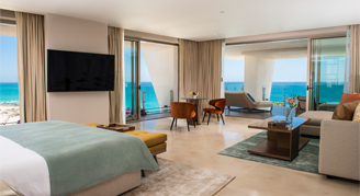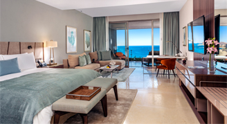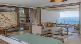 Suites feature a partial-ocean view or an ocean view. Additional amenities include a plunge pool on the terrace and a separate living and dining area.