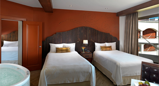 Additional amenities include a rooftop terrace with a hydro spa tub and lounge chairs, and an additional hydro tub in the room with two double beds.