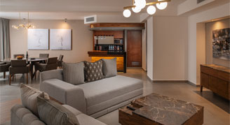 Suites feature a mangrove and sunset-view. Additional amenities include a separate living and dining area and multiple balconies.