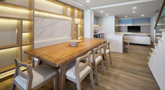 Villas are a three-story design and feature a garden-pool view. The villas are located in low-rise buildings separate from the main hotel building. The ground floor features a kitchen, a sunken living room, a dining area, a bathroom, and a terrace with access to the garden and the main pool. The second and third floors feature three bedrooms, each with a private bath. This category is not recommended for guests with mobility issues.