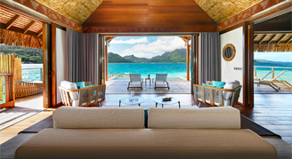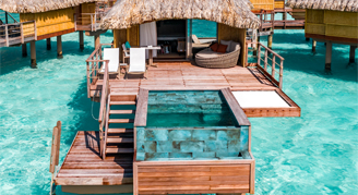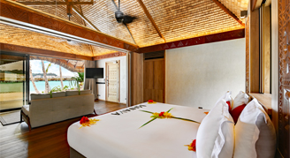 Bungalows offer views of Mount Otemanu and the surrounding lagoon and feature a spacious bedroom area with an en-suite bathroom complete with bathtub and separate shower, a furnished sundeck with gazebo and direct access to the lagoon. Additional amenities include a glass coffee table that slides open for fish feeding.