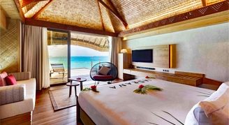 Bungalows are located close to the resort and feature a spacious bedroom area with an en-suite bathroom complete with bathtub and separate shower, a furnished sundeck with gazebo and direct access to the lagoon. Additional amenities include a glass coffee table that slides open for fish feeding.