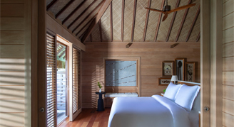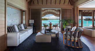 All resort overwater bungalow suites and beachfront villa estates offer air-conditioning and ceiling fan options, twice daily housekeeping service with evening turndown, personal espresso coffee and tea maker, two wall-mounted plasma televisions, DVD/CD player in the living space, and more. Take in your beautiful surroundings form your own large private terrace with two cushioned teak chaise lounges, lagoon access, and outdoor shower. Experience the beachfront villa estates which all sit on a gleaming, secluded white-sand beach and offer a private pool. One-Bedroom Front Mountain-View Overwater Bungalow Suite noting that name change starting 5/1/26.