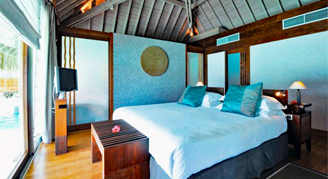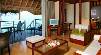 All bungalows feature a separate bedroom and a walk-in dressing room, as well as a glass-bottom coffee table for viewing sea life. Additional amenities include two flat screens, a CD player, an espresso machine, 110V/220V shaver plug, Bose sound dock for iPod, direct-dial international telephone, outdoor dining on a split-level sundeck with an outside shower and easy access to the lagoon.