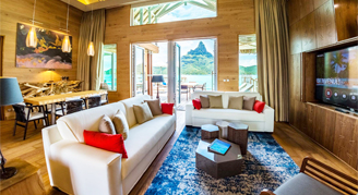 Suites are located on the end of the pontoon and feature a view of Mount Otemanu. Additional amenities include a living area, a dining room table, an outdoor pool, a sundeck with lounge chairs and a freshwater shower with direct access to the lagoon.