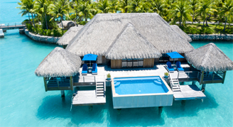 Villas offer sunset views over Mt. Otemanu. Amenities include private terrace with whirlpool, gazebo, private pontoon and an outdoor shower.