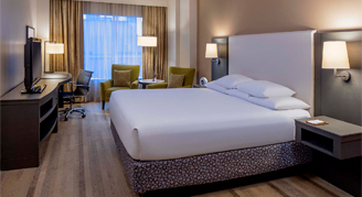 Rooms are located on higher floors and feature one king bed, workstation, and bathroom with a glass-enclosed walk-in shower. Additional amenities include a 55-inch flat-screen TV, Rainforest Green and Boona single-serve coffee and tea maker, mini refrigerator, and BeeKind hypoallergenic bath amenities.