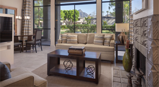 Enjoy resort views in these elegant, modern rooms offering a spacious patio which features a firepit.