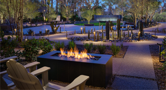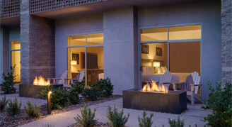 Discover the essence of the desert when you step onto your private patio, which features a firepit and seating area framed by desert garden views. This retreat boasts a luxurious king bed and a cozy sitting area, inviting you to relax and unwind.