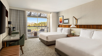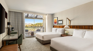 Unwind in this expansive room, featuring two plush queen beds, a soothing bathtub and a sleeper sofa. Embrace the tranquil atmosphere of the desert with picturesque views from your private patio.