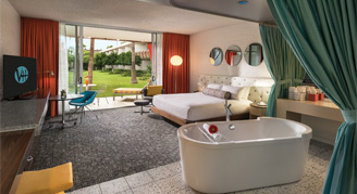 Studios feature a designer Philippe-Starck tub in the center of the room, separate shower, private patio or balcony, private bar and floor-to-ceiling glass.