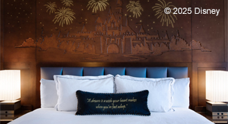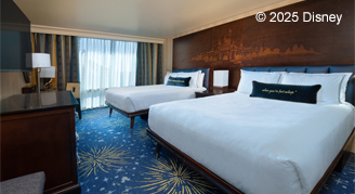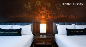 Rooms at the Disneyland Hotel are both sophisticated and whimsical, paying loving tribute to the classic years of Disneyland Park. Upscale styling, state-of-the-art amenities, and special Disney furnishings—including light-up Sleeping Beauty Castle headboards and timeless artwork—provide a stay your entire family will treasure.
