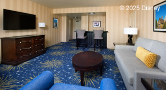 Suites include two queen beds, a bathroom with a shower/tub combo, separate living area with a queen-size pull-out sofa and views of the resort, pool, or Downtown Disney District.