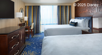 Rooms feature two queen beds, a bathroom with a shower/tub combo, desk, and views of Downtown Disney District.