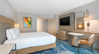 Rooms feature one king bed, floor-to-ceiling windows, a work desk with a digital charging panel and 55-inch flat screen HDTV.