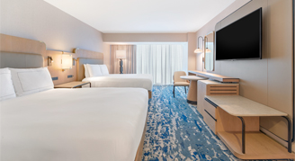 Rooms feature two queen beds, floor-to-ceiling windows, a work desk with a digital charging panel and 55-inch flat screen HDTV.