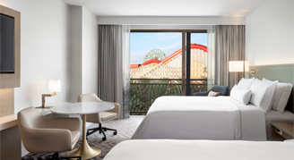 Rooms feature two queen beds, a sitting area with a moveable work desk and chair, bathroom with a lighted makeup mirror and a balcony with views of the theme park. Additional amenities include a Keurig coffee maker, bathrobe, slippers and a 55" HD LED TV.