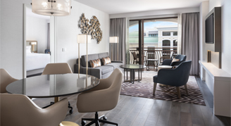 Rooms feature one king bed, a sitting area with a pull-out sofa, movable work desk and chair, bathroom with a lighted makeup mirror and views of the resort. Additional amenities include a Keurig coffee maker, bathrobe, slippers and a 55" HD LED TV.