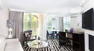 Suites feature one king bed and a separate living area with a couch, dining table and 60-inch LED TV, and a desk, marble bathroom, fireplace and balcony.