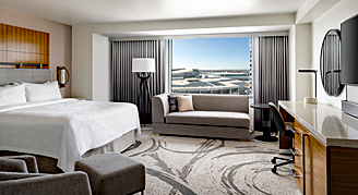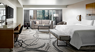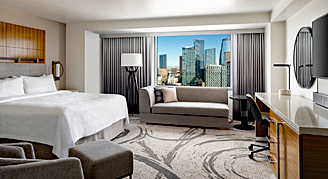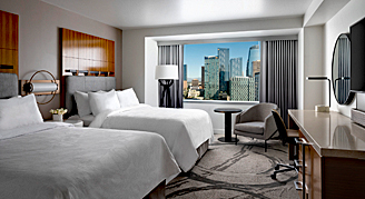 The rooms at JW Marriott Los Angeles L.A. LIVE embody a sense of urban elegance and Angeleno style. Guestrooms feature distinctive redwood accents and brushed bronze finishes balanced with warm, neutral tones. Enjoy views of the downtown skyline, L.A. LIVE entertainment district, and surrounding Hollywood Hills.