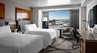Rooms feature two queen beds, a marble bathroom, and sitting area with a sofa, chair and table with views of the city.