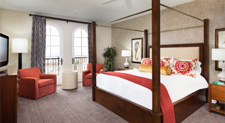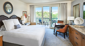 Rooms feature one king bed, a writing desk, a walk-in shower, separate bathtub and a balcony or patio.
