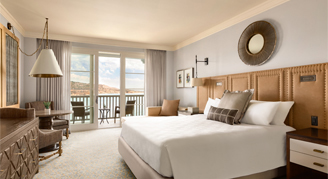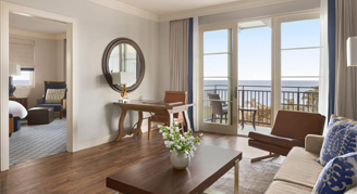 Suites feature one king bed, a separate living area with a pull-out sofa, a stone bathroom with a separate shower and bathtub, an additional guest bathroom, a balcony or patio and views of the Pacific Ocean.