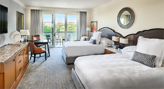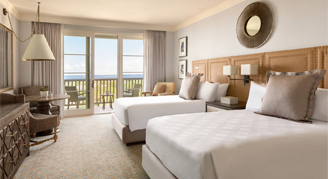 Rooms feature two double beds, a writing desk, a walk-in shower, separate bathtub, a balcony or patio and partial views of the Pacific Ocean.