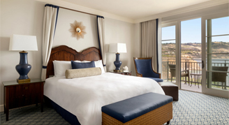 Rooms feature one king bed, a writing desk, a walk-in shower, separate bathtub, a balcony or patio and views of the Pacific Ocean.