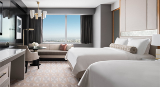 Rooms feature two queen beds, a marble bathroom with dual vanity sinks, and sitting area with a sofa, chair and table with views of the city.