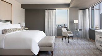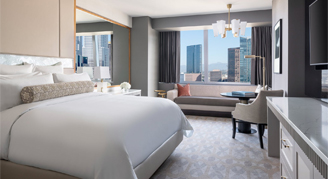 Rooms feature one king bed, a marble bathroom with dual vanity sinks, and sitting area with a sofa, chair and table with views of the city.