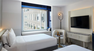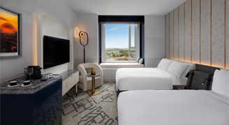 Rooms feature two queen beds, a window seat, and a marble bathroom with a courtyard or partial-city view.