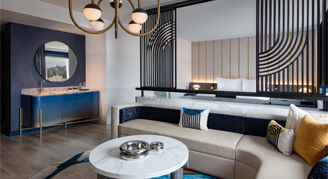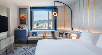 Suites feature one king bed, a marble bathroom with a separate shower and bathtub, fully stocked wet bar, and a living room area with views of the city.