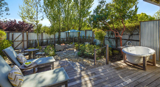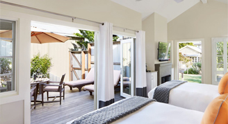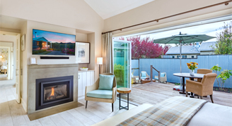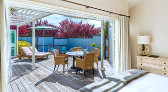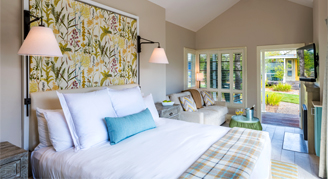 Charming and well appointed, the standalone Garden Cottages overlook a private patio. Cottages feature an indoor fireplace, private backyard and patio with an outdoor fire pit, an outdoor shower, Plum wine dispenser for on-demand wine, and a dual vanity bathroom with Carneros signature amenities.