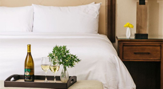Set in the Mansion Residences neighborhood, rooms feature one queen bed, a mini-fridge, complimentary bottle of wine and a walk-in shower.