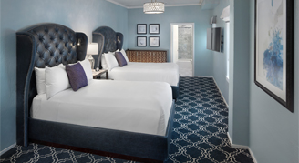 Rooms feature two queen beds, a workspace with bay views, and a bathroom with an accessible tub. Additional amenities include a Keurig coffee machine, Le Labo bathroom amenities, and plush terry cloth bathrobes.