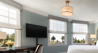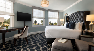 Suites feature one king bed, a seating area with a table and two chairs, a workspace, and a private outdoor deck atop Claremont’s iconic Tower with 360-degree views of the bay. Additional amenities include a Keurig Coffee maker and plush terry cloth bathrobes.
