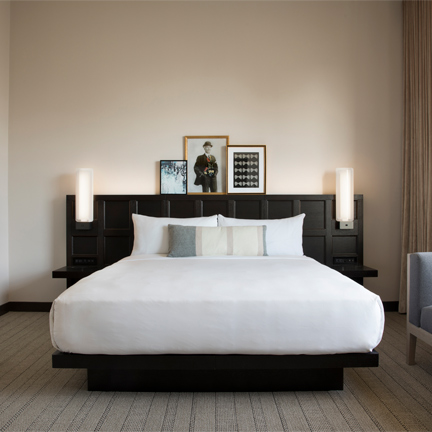 Rooms feature one queen bed, a workspace and bathroom with an accessible tub. Additional amenities include a Keurig coffee machine, Le Labo bathroom amenities, and plush terry cloth bathrobes.