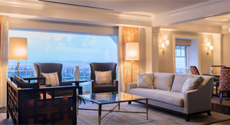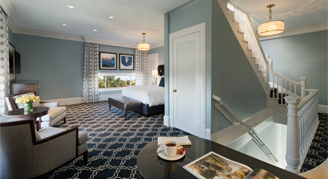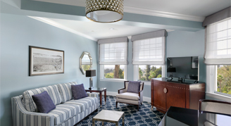 Suites feature one king bed, a separate living area, a separate dining area, a wet bar and pantry with a separate service entry, a guest half bathroom, a private office, a bathroom with a separate shower and soaking tub, and views of the bay. Additional amenities include a Keurig Coffee maker and plush terry cloth bathrobes. Please note that these suites are not pet-friendly.