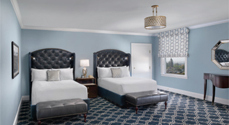 Rooms feature two double beds and a workspace with bay views. Additional amenities include a Keurig coffee machine, Le Labo bathroom amenities, and plush terry cloth bathrobes.