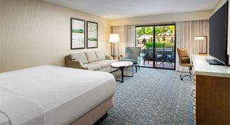 Rooms feature one king bed and pull-out sofa or two queen beds with a chair, writing desk, and private balcony or patio with garden or pool views.