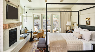 Cypress Cottages are historic cottages that have been carefully restored to preserve their original details featuring exposed beams and warm wood floors. Cottages feature an enclosed, covered front porch with rocking chairs and a daybed swing; one bedroom with either a king or queen bed and alcove seating; a separate living room with a loveseat, chair and dining table with seating for four; bathroom with a walk-in shower and separate clawfoot soaking tub; and patio with lounge seating, firepit, and bistro table with seating for two.