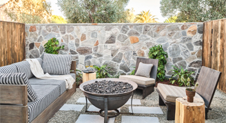 Suites feature one bedroom with a king bed, a cozy seating area with a fireplace, bathroom with an accessible tub and toilet with grab bars, bistro table for two and private a garden terrace with outdoor fire pit with lounge seating.