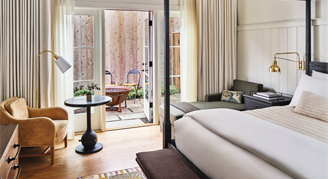 Located on the garden level, rooms feature a king bed, a garden patio terrace with lounge area and an outdoor fire pit, a window bench seating area, an indoor fireplace, and an accessible tub with grab bars.