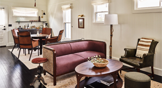 Cedar Cottages are historic cottages that have been carefully restored to preserve their original details featuring exposed beams and warm wood floors. Cottages feature a small front porch with a bench; one bedroom with a king bed and a chaise lounge seat; separate living room with a sofa, chair and dining table with seating for two; bathroom with a walk-in shower and separate clawfoot soaking tub; and patio with a lounge area and firepit.