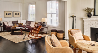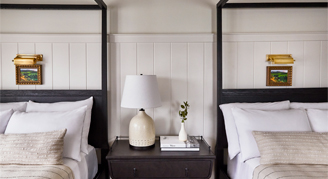 Oak Cottages are historic cottages that have been carefully restored to preserve their original details featuring exposed beams and warm wood floors. Cottages feature a front porch with two rocking chairs; master bedroom with one king bed, sitting chair and master bathroom with a walk-in shower; second bedroom with one queen bed, a chaise lounge chair and second bathroom with double sink and walk-in shower; living room with a large sofa, fireplace and table with seating for four; and patio with a daybed and chairs.