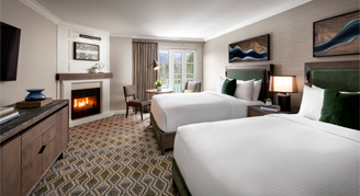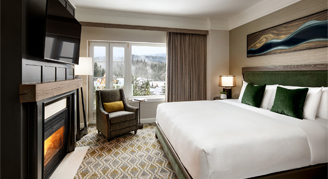 Fairmont Gold Rooms provide luxurious surroundings including gas fireplace and upgraded amenities including a four piece bathroom, soaker tub and views of Rainbow Mountain or Woodlands.