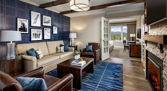 Deluxe Slopeside View Rooms feature a cozy sitting area, the most popular view of Whistler Mountain and the slopes of Blackcomb.