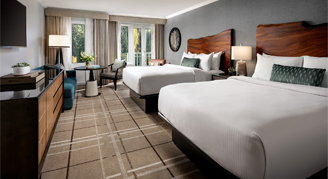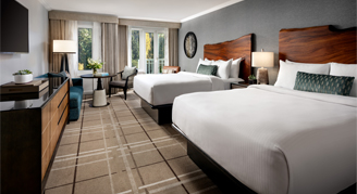 These unique suites located on the 10th and 11th floors are richly appointed, featuring a comfortable living room with a fireplace, double sofa bed, two side chairs and two flat screen televisions. The dual sleeping spaces include a king bedded area that is partially separated from the living area by partition, and a second bedroom with two queen beds. The Suite includes two bathrooms, including one deluxe marble bathroom with a jetted tub, oversized shower with Skinjay aromatherapy, and a double vanity. A triple set of French doors open up onto a viewing balcony with breathtaking views.