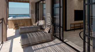 Suites feature a rain shower, full-length mirror, beauty station, double vanities, an ample closet area, and a private terrace with direct access to the pool.